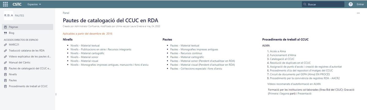 Les Pautes de catalogació en RDA, una normativa seguida internacionalment, es troben en constant modificació i actualització per part de diversos grups de treball de catalogadores, i marquen les directrius catalogràfiques que han de seguir les biblioteques del CCUC amb l'objectiu de facilitar i agilitzar la catalogació i la interpretació a la normativa catalogràfica a tota la comunitat de les institucions del CCUC. Actualment hi ha pautes en RDA per a llibres, llibres antics, revistes i bases de dades, material cartogràfic, col·leccions especials i fons d'arxiu, mentre que queden pendents d'adaptar a les RDA les pautes per a recursos sonors i audiovisuals.