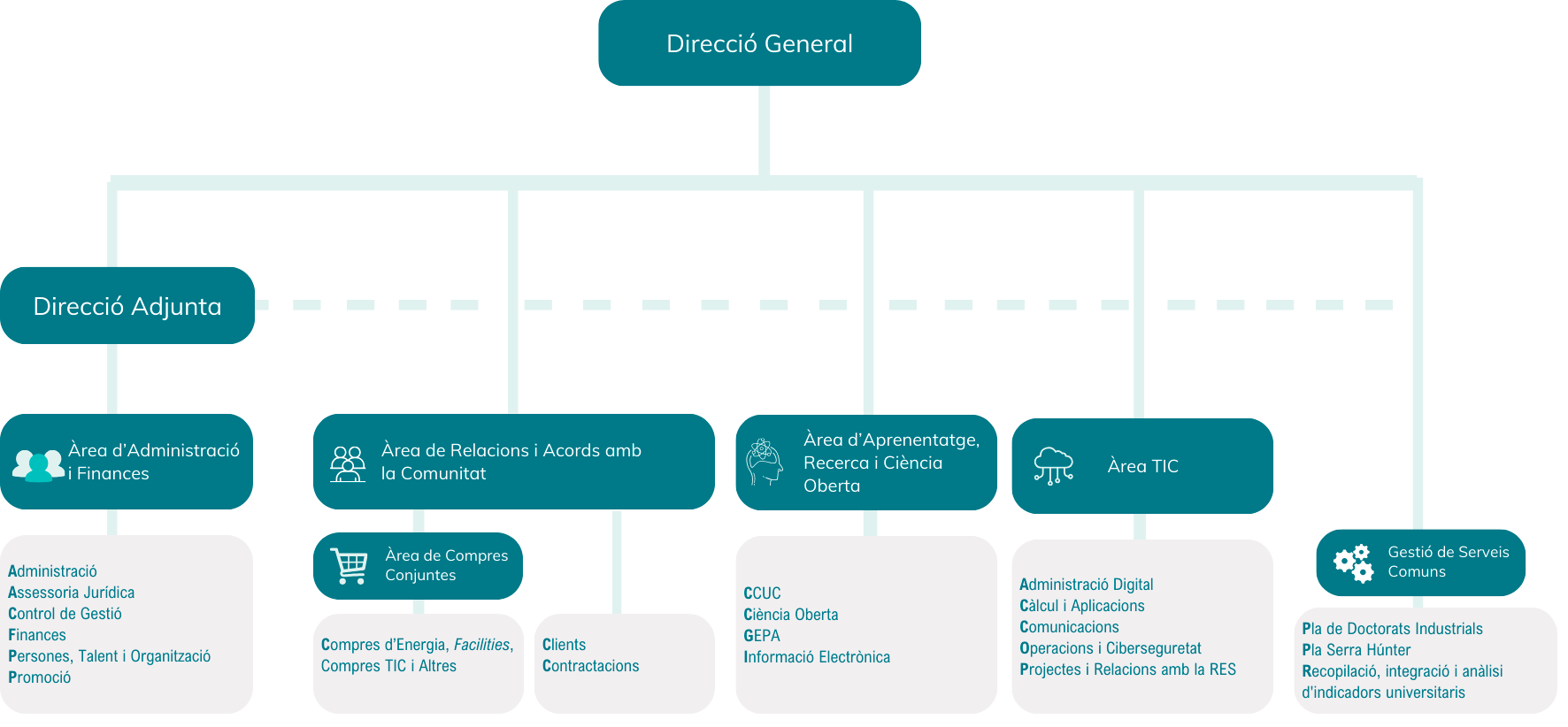El CSUC està estructurat en una àrea administrativa i cinc de tècniques.