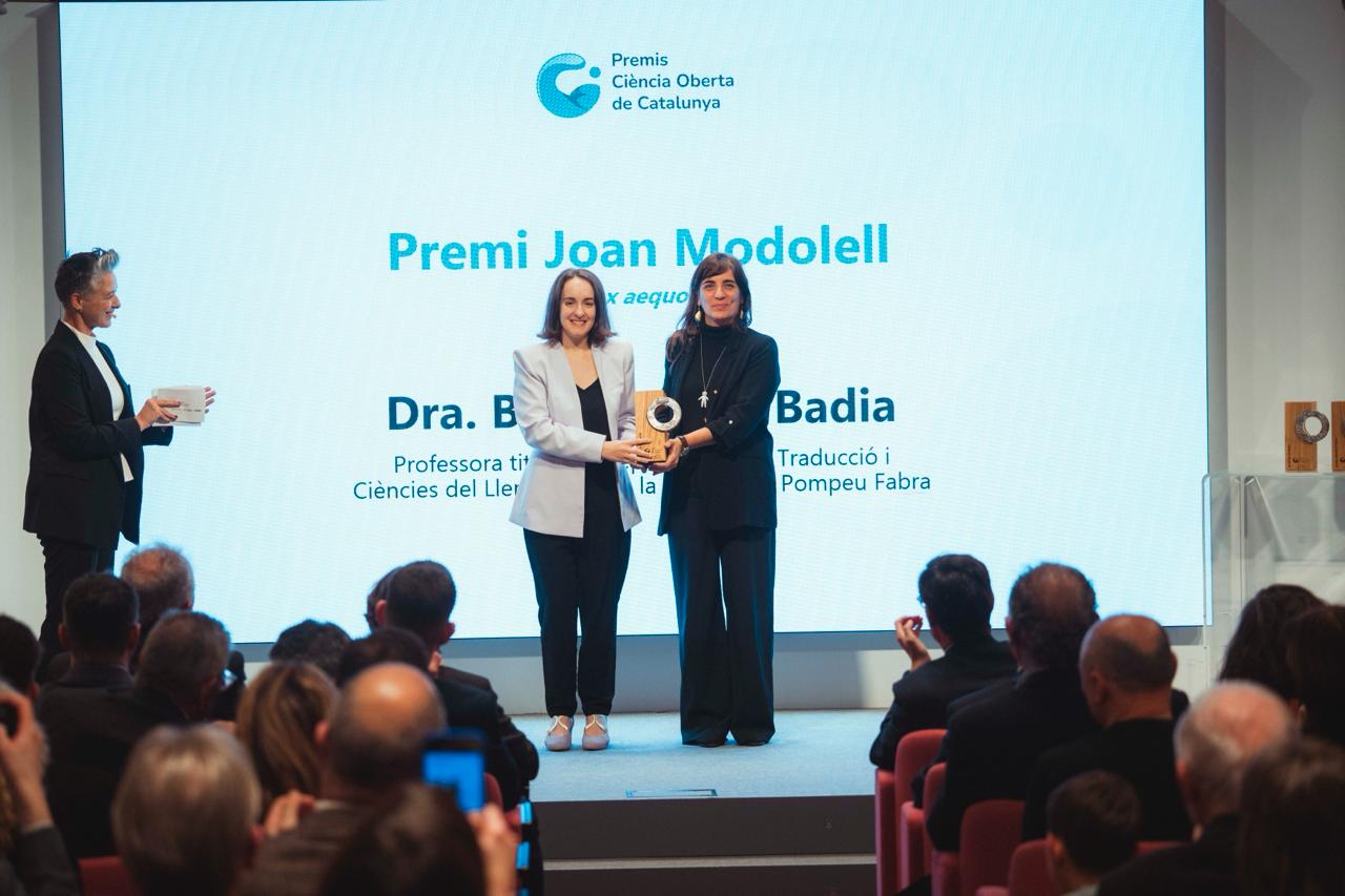 Blanca Arias, profesora titular en el Departamento de Traducción y Ciencias del Lenguaje de la UPF, recoge el Premio Joan Modolell.